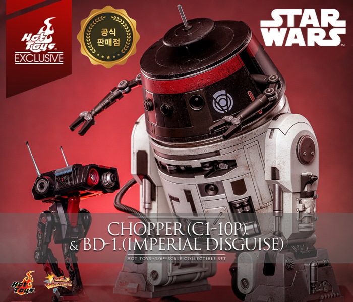상품명STAR WARS™CHOPPER (C1-10P™) & BD-1™ (IMPERIAL DISGUISE)[HOT TOYS EXCLUSIVE]1/6TH SCALE COLLECTIBLE SET구성 및 디테일1/6 스케일 액션피규어- 차퍼(C1-10P™)- BD-1™ (제국군 위장)- 마우스 드로이드™(MSE-6 시리즈 수리 드로이드)1/6 스케일 차퍼(C1-10P)- 스타워즈™의 초퍼를 그대로 닮은 정교하고 사실적인 모습- 10개의 관절로 이루어진 정교한 기계식 구조- 약 18cm의 높이- 보블 헤드 디자인- 미묘한 웨더링 효과와 함께 적용된 검은색과 빨간색의 제국풍 색채의 정교한 페인트 도색- 특별 기능 포함- 지형 트레드 다리(회전식 바퀴 포함)- 탈착식 중앙 트레드 다리 (회전식 바퀴 포함)- 스타일의 교체 가능한 안테나(일반 및 확장 모드)- 교체 가능한 포어암(일반 및 제스처)이 있는 관절형 기계식 암- 가슴 부분에 수납된 관절형 기계식 팔