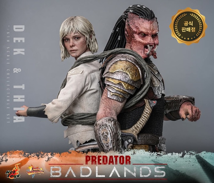 1/6스케일 액션피규어* Dek 피규어 1종* Thia 피규어 1종* *Predator: Badlands*에서 Dek 역의 **Dimitrius Schuster-Koloamatangi**의 사실적 외형 재현* 새로운 헤드 조형(개별 조절 가능한 롤링 아이 기능 적용)* 섬세한 표정 및 피부 디테일* 교체 가능한 두 가지 헤어 스타일:* 블랙 올백 드레드락 스타일* 블랙 다이내믹 드레드락 스타일* 교체 가능한 맨더블(턱) 2세트(오픈형 / 일반형)* 약 30.5cm 높이* 16개 관절의 신규 개발 바디* 목, 상흉부, 팔, 다리는 심리스 소프트 비닐 소재 사용* 새롭게 개발된 교체용 손 6종:* 발톱 제스처 손 1쌍* 검/활&화살 잡는 손 1쌍* 슈리켄 잡는 손 1쌍**의상*** 블랙 튜닉 1벌* 마모된 금속 질감의 신규 아머 세트:* 흉갑* 폴드론(어깨 장갑)* 폴즈(허리 장갑)* 손목 건틀릿 1쌍* 그리브(종아리 보호구) 1쌍**무기*** 숄더 캐논 1개* 폴더블 플라즈마 소드 1개* 접힌 상태의 플라즈마 소드 1개(허리에 장착 가능)* 폴더블 보우 & 애로우 1세트(자석 방식으로 Dek의 등 뒤에 장착 가능)* 오픈 상태 슈리켄 1개* 클로즈 상태 슈리켄 1개* 왼쪽 손목 건틀릿 장착용 손목 블레이드 2개**액세서리*** 바이오 마스크 1개* *Predator: Badlands* 로고가 포함된 모래 지형 디자인의 스페셜 스탠드