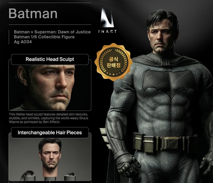 구성 및 디테일1/6스케일 액션피규어재질PVC, ABS, 다이캐스트, 실리콘, 리얼 패브릭 등제품 사이즈35.8cm(H) × 14cm(W) × 11cm(D)피규어 높이 약 32.7cm피규어 1개교체형 카울 2개교체형 페이스 플레이트 3개넥 어댑터 2개넥 어댑터 1개스플릿 카울 넥 어댑터 1개교체형 손 파츠 10개주먹 손 1쌍자연스러운 손 1쌍그래플 건 파지용 오른손 1개배터랭 파지용 오른손 1개배트 브랜드 파지용 오른손 1개유탄 발사기 파지용 오른손 1개소품 지지용 왼손 1개제스처용 왼손 1개배트슈트 1개벨트 1개와이어 포징 망토 1개드레이프 망토 1개그래플 건 1개접힌 그래플 훅 2개전개형 그래플 훅 2개유탄 발사기 1개저격소총 1개크립토나이트 수류탄 2개연막탄 1개배트 브랜드 2개배트랑 4개베이스 및 스탠드