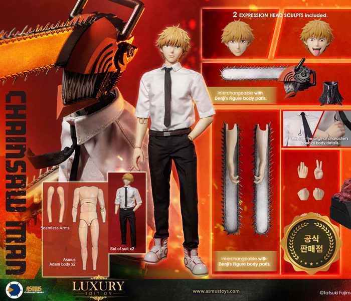상품명CSM001LUX 1/6 Chainsaw Man DenjiLuxury Edition출시 및 입고 예상 일정26년 3분기[제조사 사정에 의해 사전 예고 없이 빨라지거나 지연될 수 있습니다]구성 및 디테일1/6스케일 액션피규어(약 30cm 크기)📦 구성품**헤드 파츠*** 일반 얼굴 헤드 × 1개* 혀 내민 얼굴 헤드 × 1개* 체인소 헤드 × 1개**핸드 파츠*** 편안한 손 × 1쌍* 주먹 쥔 손 × 1쌍* 무기 잡는 손 × 1쌍* “피스(야)” 제스처 손 × 1개* 시동줄 잡는 손 × 1개**액세서리*** 체인소 암(Chainsaw Arms) × 1쌍* 체인소 헤드 전용 목 파츠 × 1개* 빨강 & 흰색 스니커즈 × 1쌍* 전용 디스플레이 베이스 × 1개* 스네이크 튜브 스탠드 × 1개**의상*** 반팔 셔츠 × 1개* 검정색 정장 바지 × 1개* 검정색 넥타이 × 1개* 벨트 × 1개